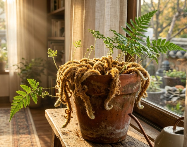 - 습도: 다른 고사리들처럼 습한 것을 좋아하지만, 털 난 뿌리줄기가 수분을 저장하고 있어 약간 건조한 실내 공기도 꽤 잘 견뎌냅니다. 그래도 가끔 분무를 해주면 잎 색이 더 선명해집니다.