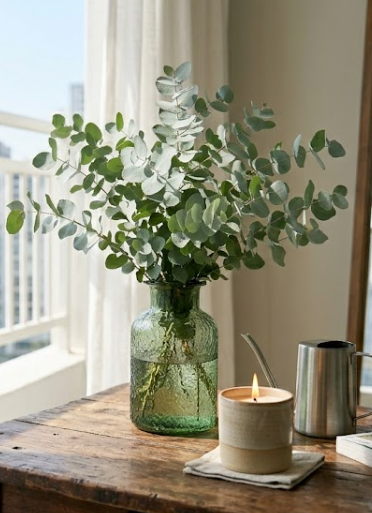 유칼립투스는 성장 속도가 매우 빠릅니다. 그대로 두면 천장까지 닿을 기세로 자라기 때문에, 원하는 높이에서 '생장점'을 잘라(순지르기) 옆으로 풍성하게 자라도록 유도해야 합니다. 자른 가지는 물병에 꽂아두거나 말려서 향기를 즐기면 좋습니다.
