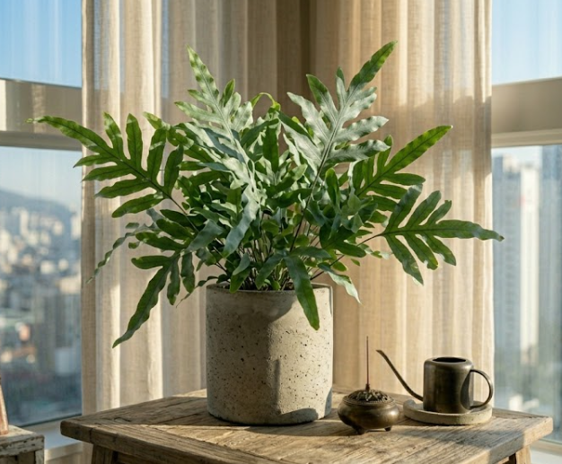 - 욕실(습도 조절): 습도가 높은 욕실은 고사리가 자라기에 최적의 장소입니다. 화이트 타일 배경에 블루스타의 푸른 잎은 시각적으로 매우 청량한 느낌을 줍니다.