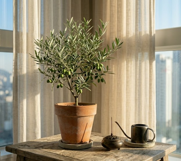 - 통풍: 올리브 나무는 바람을 좋아합니다. 통풍이 안 되면 '응애'나 '깍지벌레'가 생기기 쉬우니 창문을 자주 열어주세요.