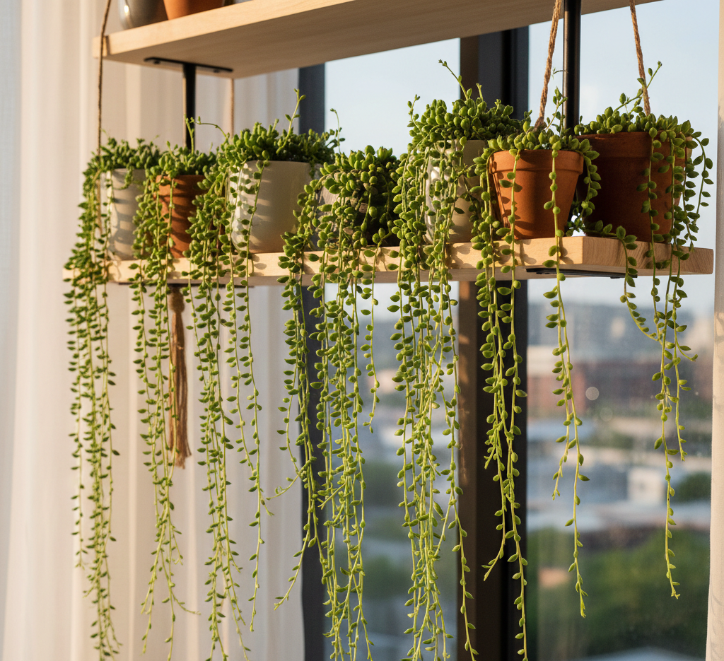 - 최적의 배치: 밝은 간접광이 드는 높은 선반이나 창가에 매달아 키우면 인테리어 효과가 극대화됩니다.